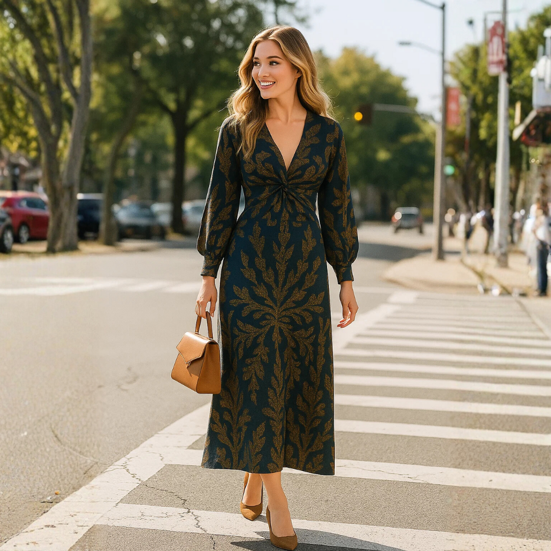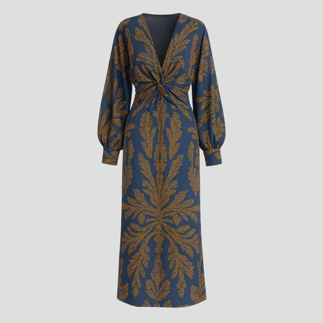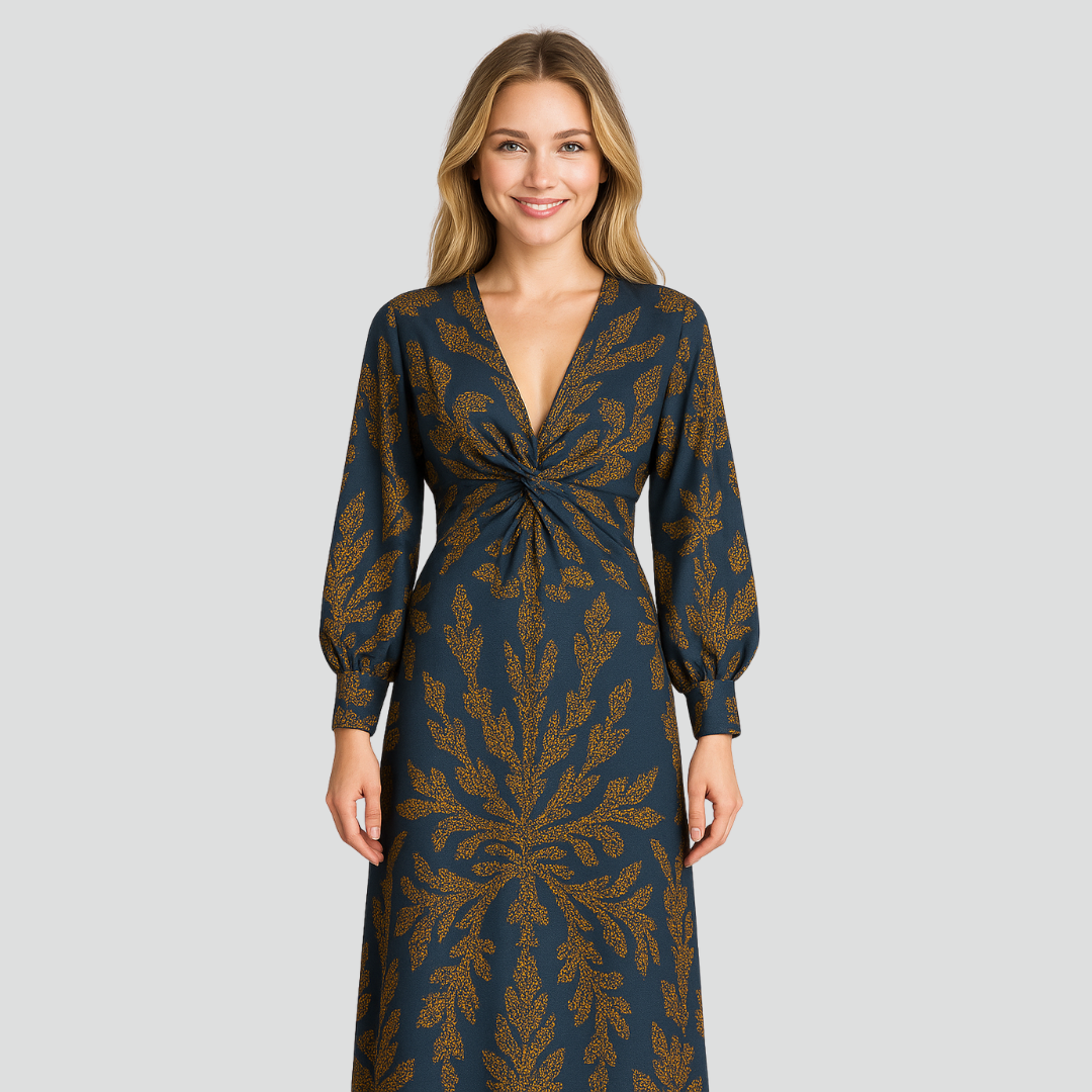 Alma Blomsterprintet Midi Kjole kombinerer tidløs elegance med moderne detaljer. Den dybblå base med gyldne blomstermønstre giver et eksklusivt udtryk, mens det twistede frontdesign fremhæver taljen på smukkeste vis. De lange ærmer og den flatterende v-udskæring tilfører kjolen en sofistikeret silhuet, perfekt til både formelle lejligheder og aftener ude.