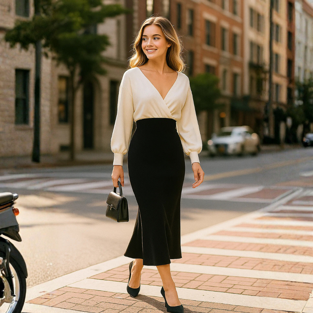 - Draperet V-udskæring: Skaber et blødt og elegant udtryk