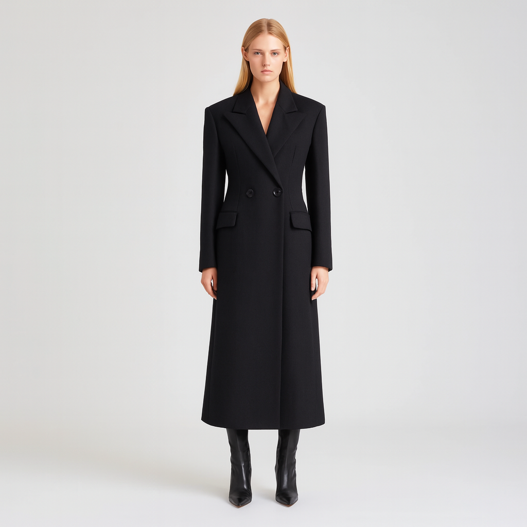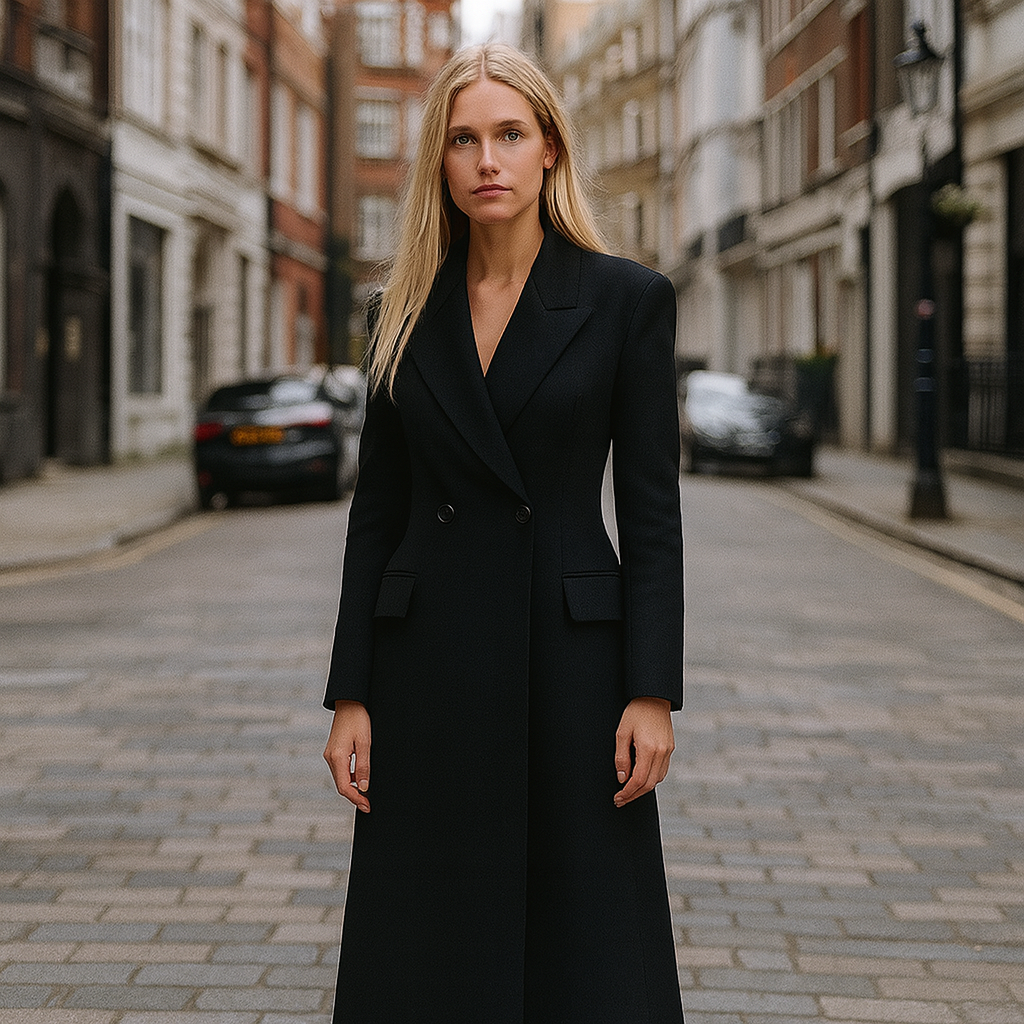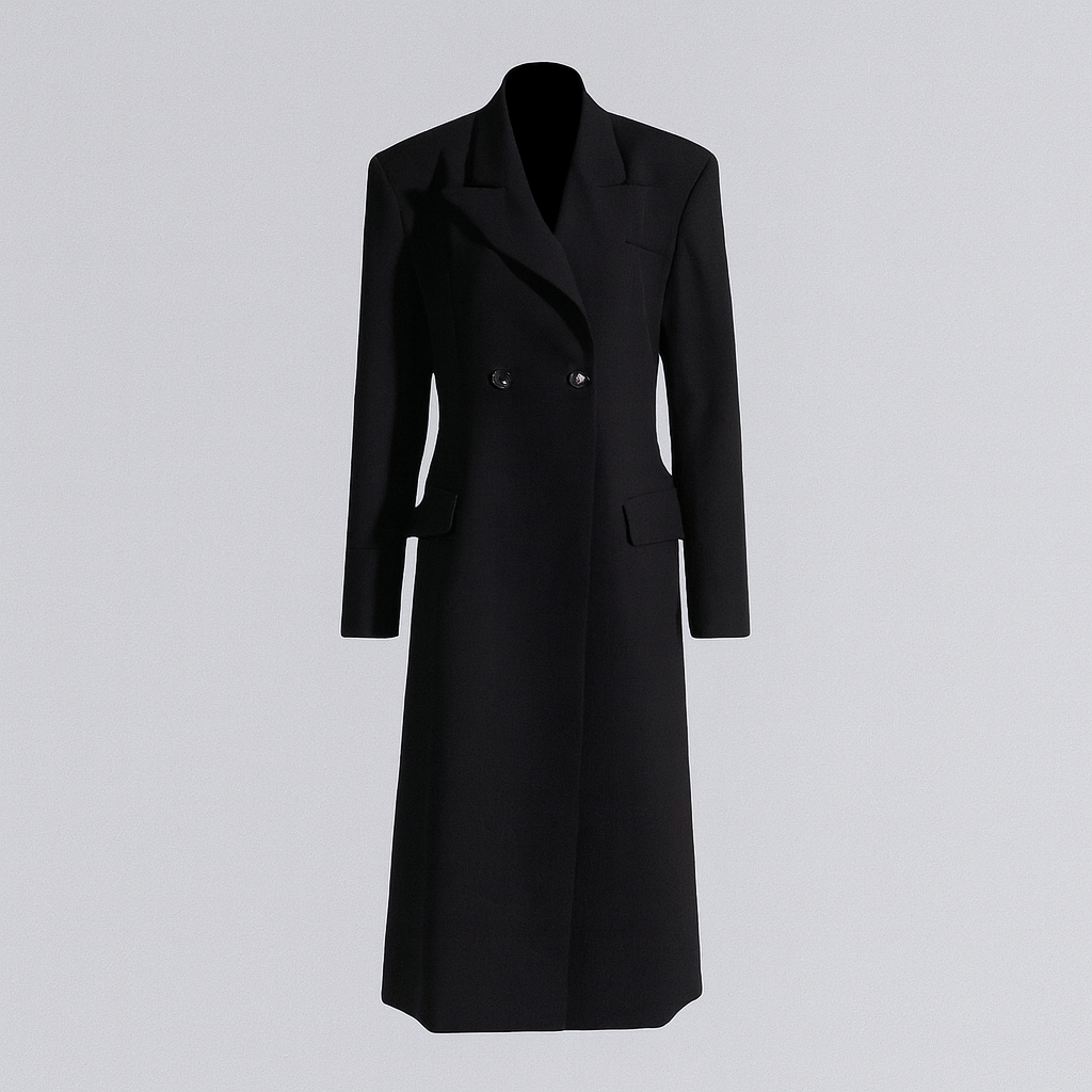 Astrid Langfrakke udstråler klassisk raffinement med et moderne twist. Den skræddersyede pasform og dobbeltradede lukning fremhæver en elegant silhuet, mens den dybe sorte tone giver et tidløst og sofistikeret udtryk. Perfekt som ydre lag over både hverdagstøj og aftenlooks – et must-have for den stilbevidste kvinde.