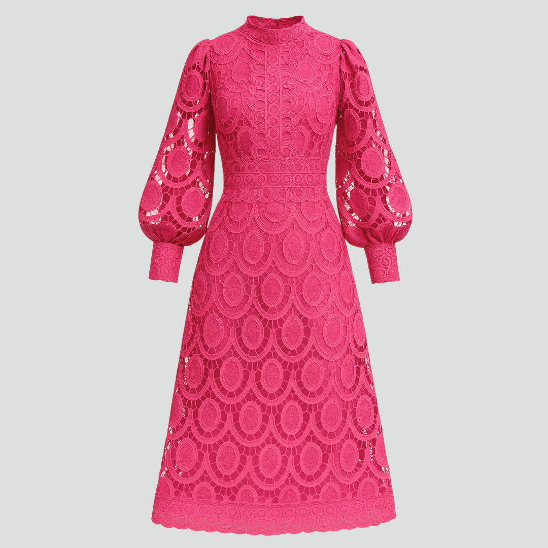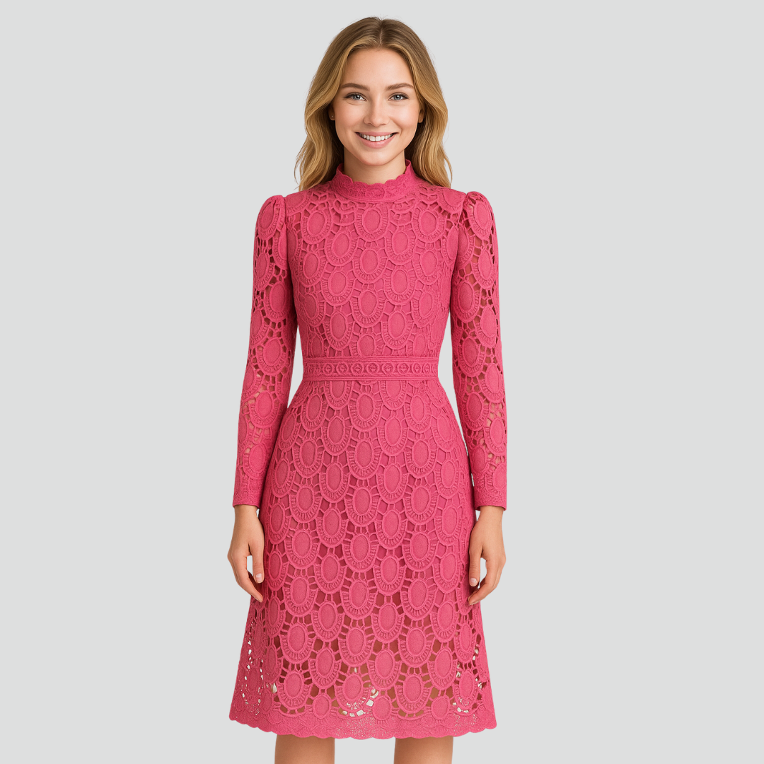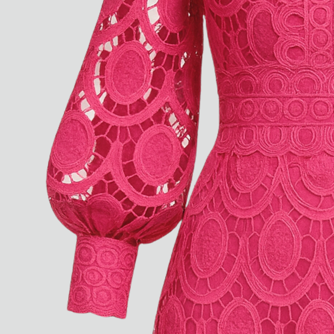 Fremhæv din feminine side med Elara Blondekjolen – en elegant og sofistikeret kjole, der kombinerer luksus og stil. Den detaljerede blondeudskæring, høje hals og lange pufærmer giver et eksklusivt look, perfekt til særlige anledninger. Kjolen fremhæver taljen smukt og falder let omkring kroppen, hvilket skaber et elegant og selvsikkert udtryk.