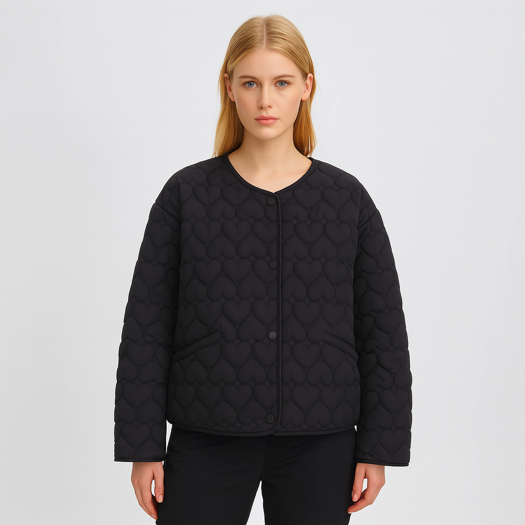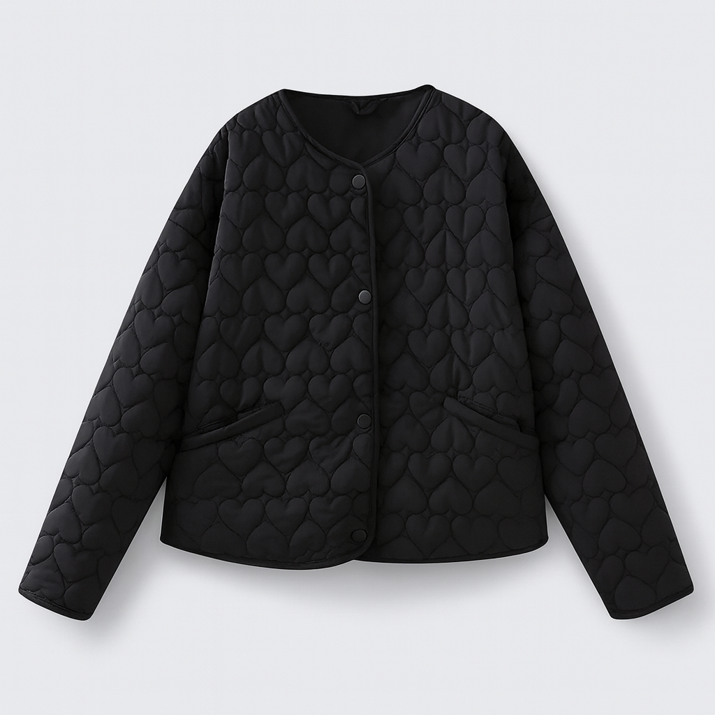 Ella Quiltet Jakke bringer et legende og moderne twist til den klassiske letvægtsjakke. Det hjerteformede quiltede mønster giver et unikt og feminint udtryk, mens den enkle knaplukning og rene silhuet gør den nem at style til både casual og elegante looks. Perfekt til overgangssæsonen, hvor du ønsker varme uden at gå på kompromis med stil.