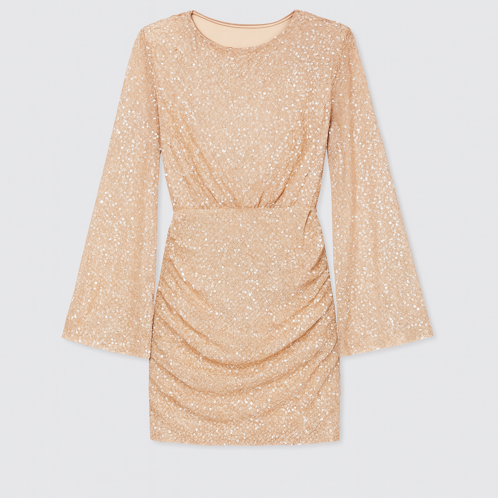 Lad din stil skinne med Fiona Pailletkjole en elegant minikjole, der kombinerer glamour og tidløs femininitet. Kjolen er dækket af glitrende pailletter, som fanger lyset og skaber et sofistikeret udtryk. De lange, let flagrende ærmer tilfører et strejf af lethed, mens den figursyede pasform fremhæver silhuetten på smukkeste vis. Perfekt til festlige aftener, hvor du ønsker et look, der er både raffineret og iøjnefaldende.