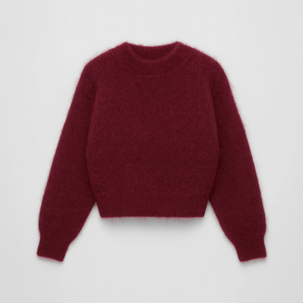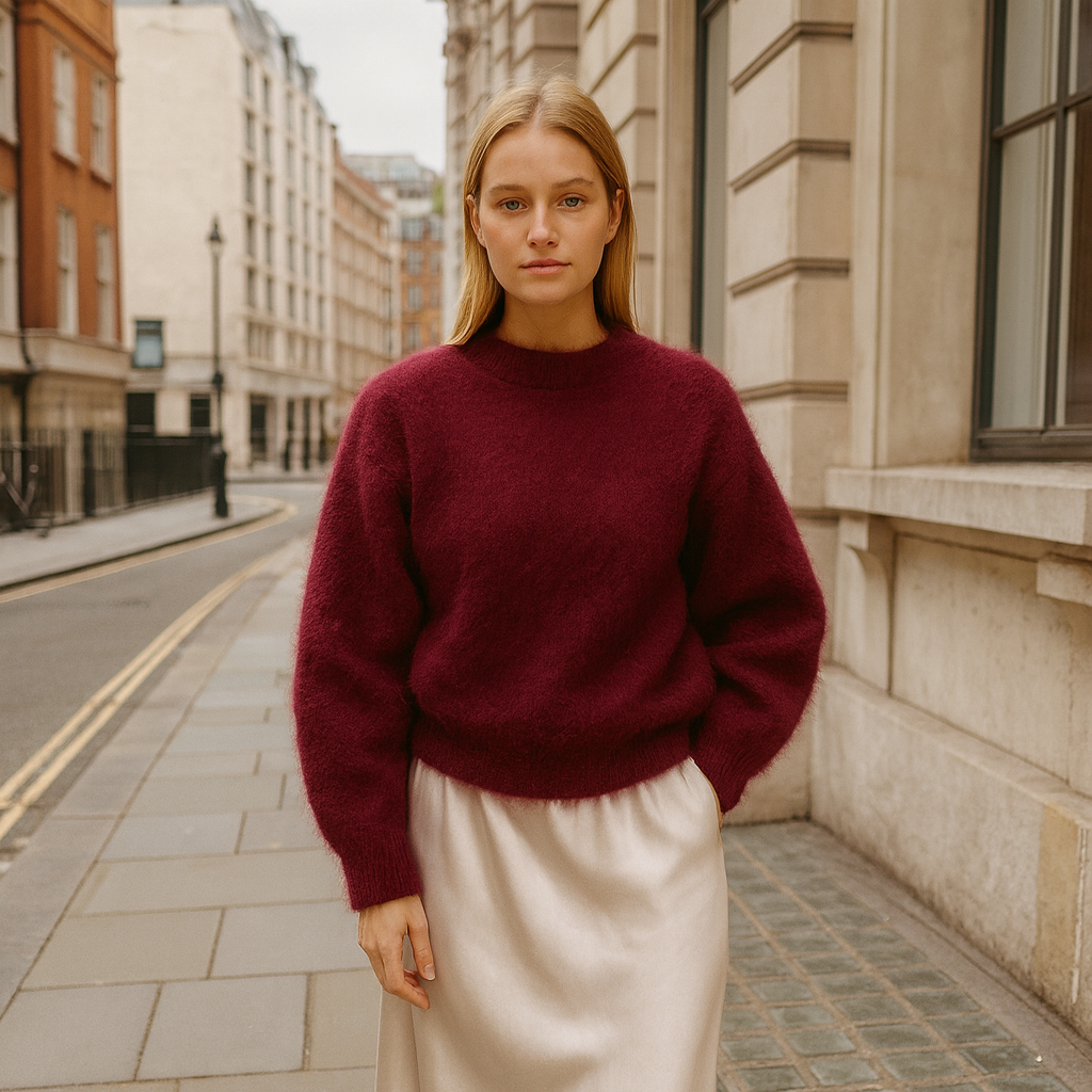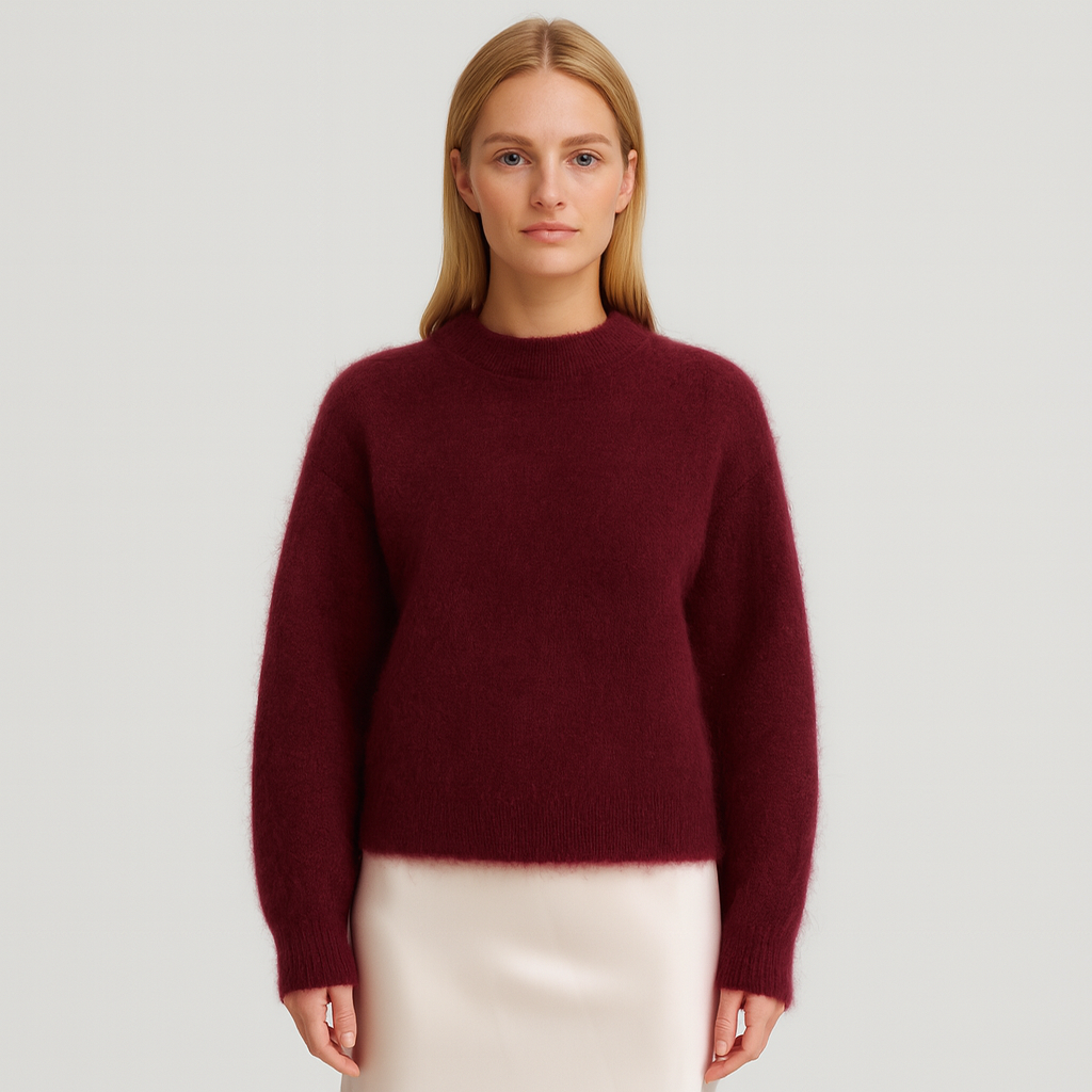 Freja Mohairstrik emmer af luksus og feminin enkelhed. Den bløde mohairblanding giver en let og luftig fornemmelse, mens den dybe bordeauxfarve tilfører varme og elegance til dit look. Perfekt til både hverdagsbrug og aftener ude – en sweater, der føles lige så smuk, som den ser ud.