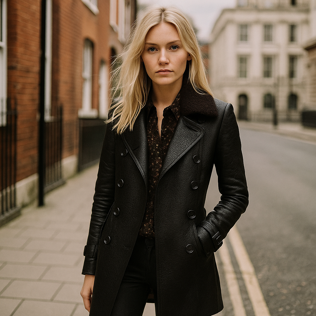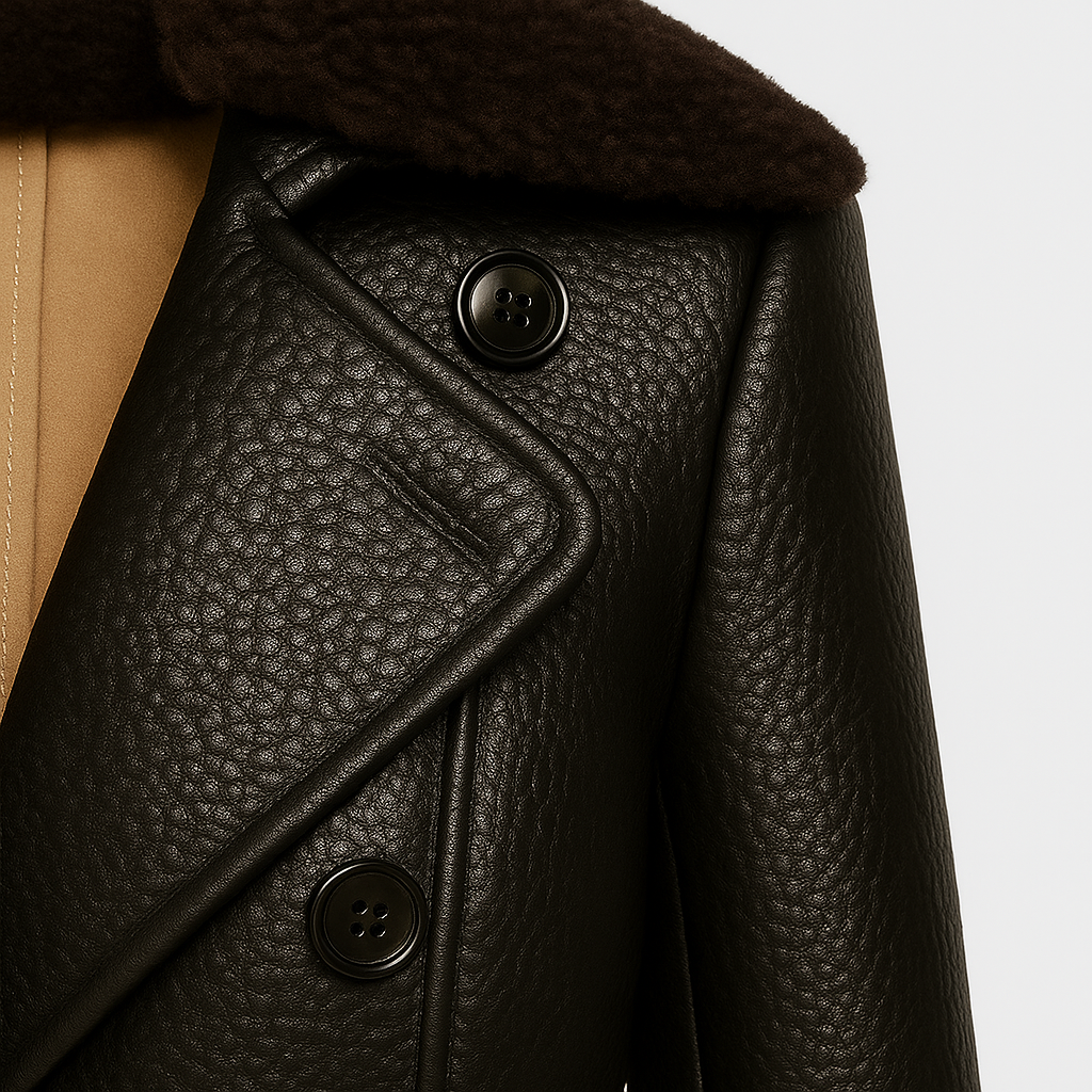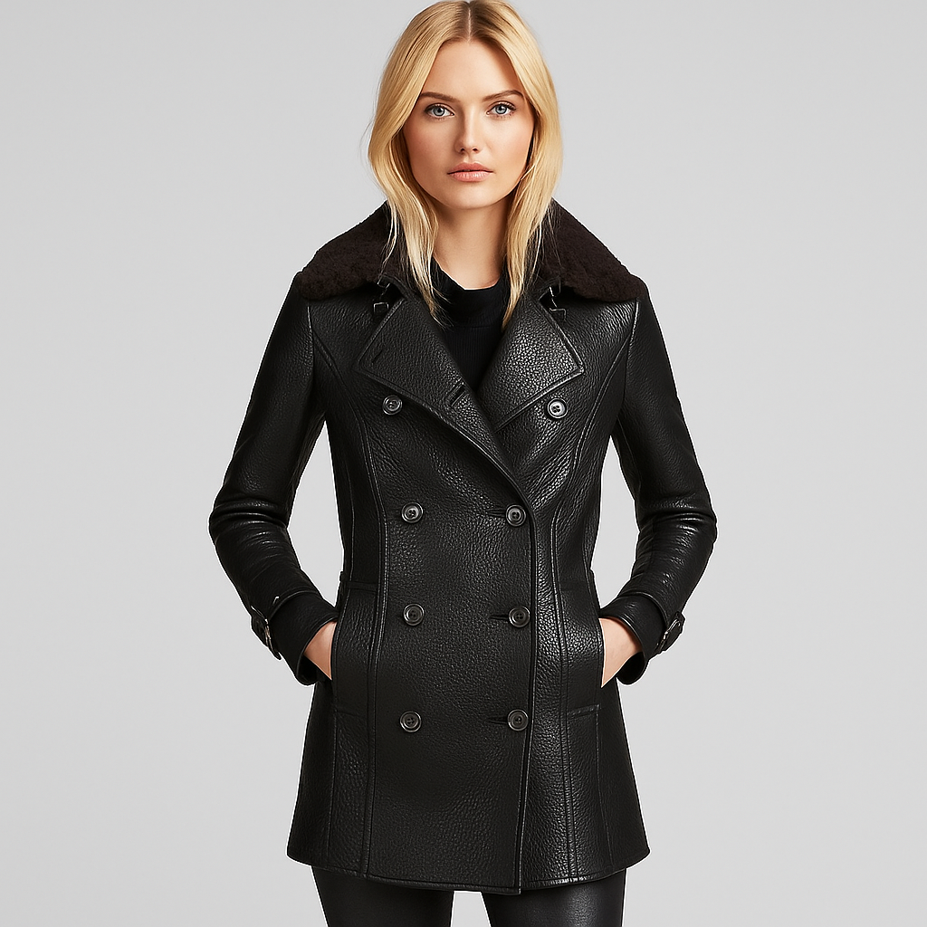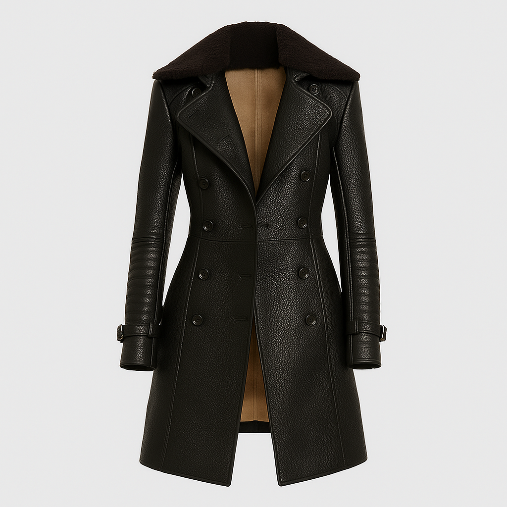 Kacee Elegant frakke i imiteret læder kombinerer et tidløst udtryk med moderne kant. Den strukturerede pasform og dobbeltradede knaplukning giver et sofistikeret look, mens den bløde krave tilføjer et varmt og luksuriøst præg. En perfekt frakke til kølige dage, hvor du ønsker at udstråle selvtillid og stil.