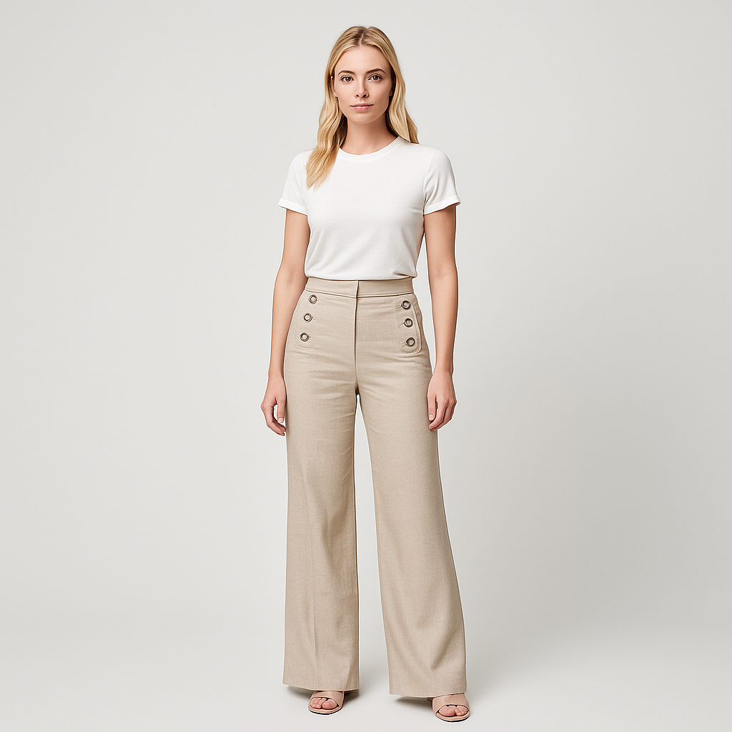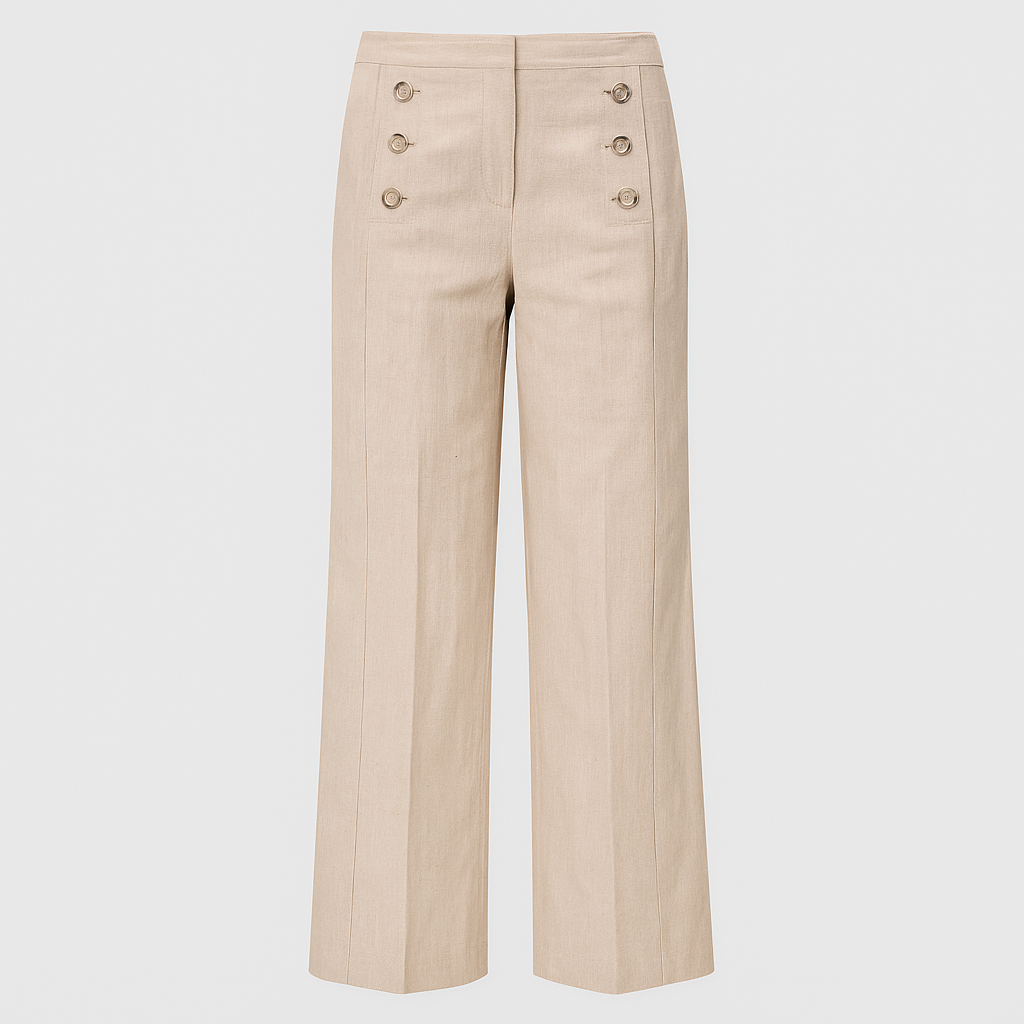 Katinas Elegante bukser med brede ben forener klassisk design med moderne stil. Bukserne har en højtaljet pasform, pyntet med dobbeltrækker knapper foran, som giver et maritimt og sofistikeret præg. Det lette stof falder smukt langs benene og skaber et elegant look, der passer perfekt til både arbejde og formelle begivenheder.