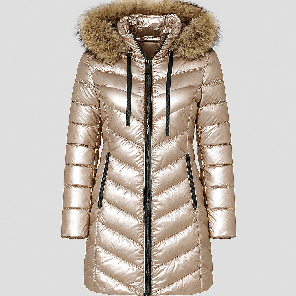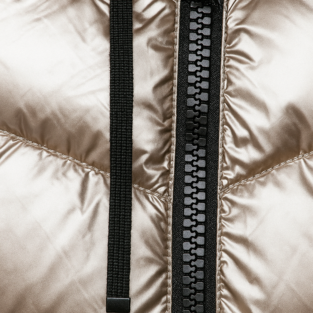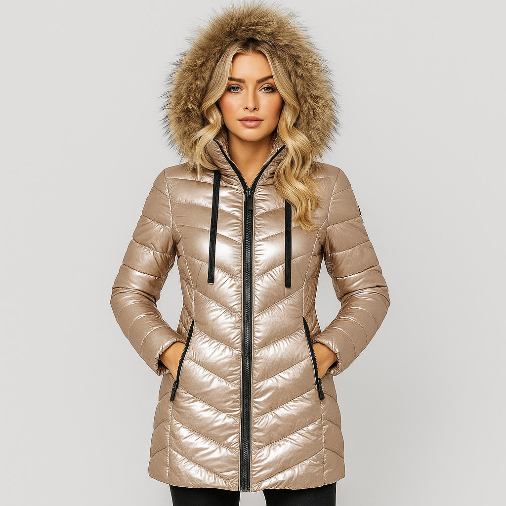 Kirsi Skinnende quiltet jakke er et moderne valg til kølige dage. Den metalliske overflade og den figursyede pasform skaber et elegant udtryk, mens den aftagelige hætte med pelskant tilføjer et eksklusivt touch. En perfekt balance mellem funktionalitet og stil.