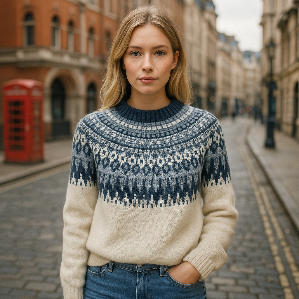 Kirstine Nordisk Strikket Sweater er inspireret af klassisk skandinavisk design med et smukt mønster i kølige blå og hvide toner. Den bløde struktur og den afslappede pasform gør den perfekt til kolde dage, hvor du ønsker både stil og varme. En tidløs sweater, der passer til alt fra jeans til uformelle vinterlooks.