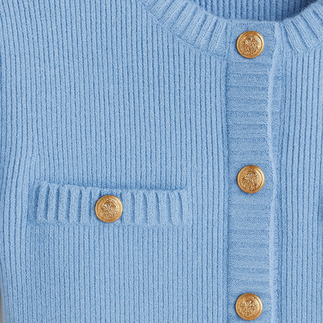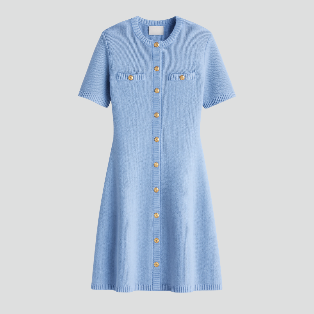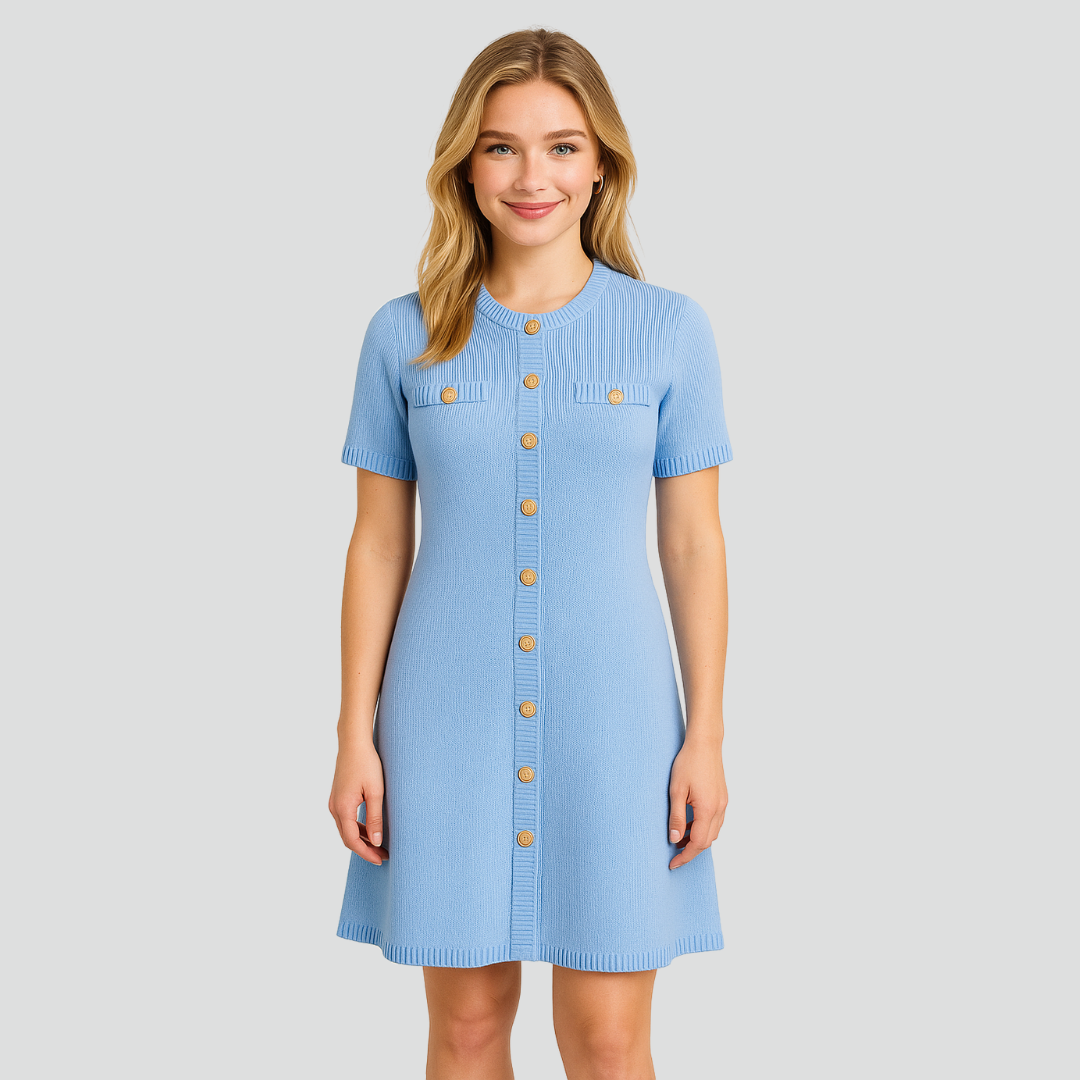 Liane Strikkjole kombinerer komfort og elegance i et moderne, afslappet design. Den lyseblå strikkjole har korte ærmer og en gennemgående knaplukning med gyldne knapper, der tilfører et sofistikeret touch. Den lette struktur og feminine pasform gør den ideel til både hverdagsbrug og uformelle sammenkomster. En alsidig favorit, der forener stil og funktion på smukkeste vis.