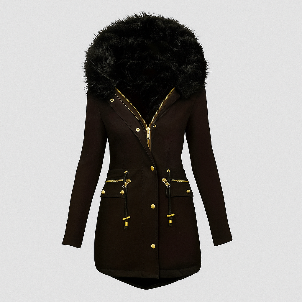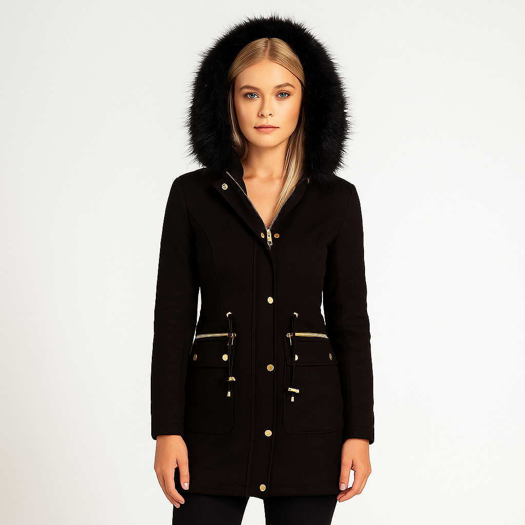 - Detaljer: Stor hætte med faux pels og dekorative lommer med guldknapper