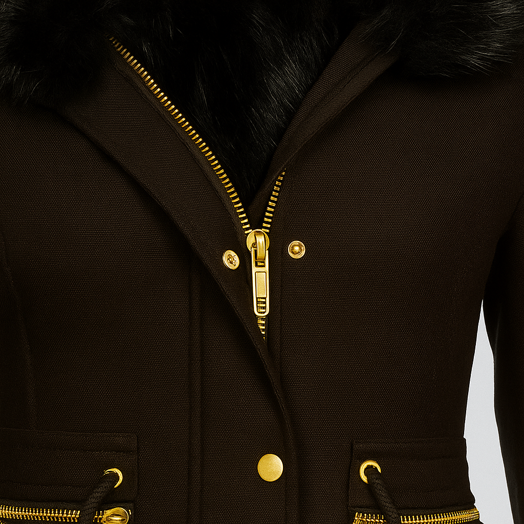 - Design: Lang parka med justerbar talje og guldlynlåse