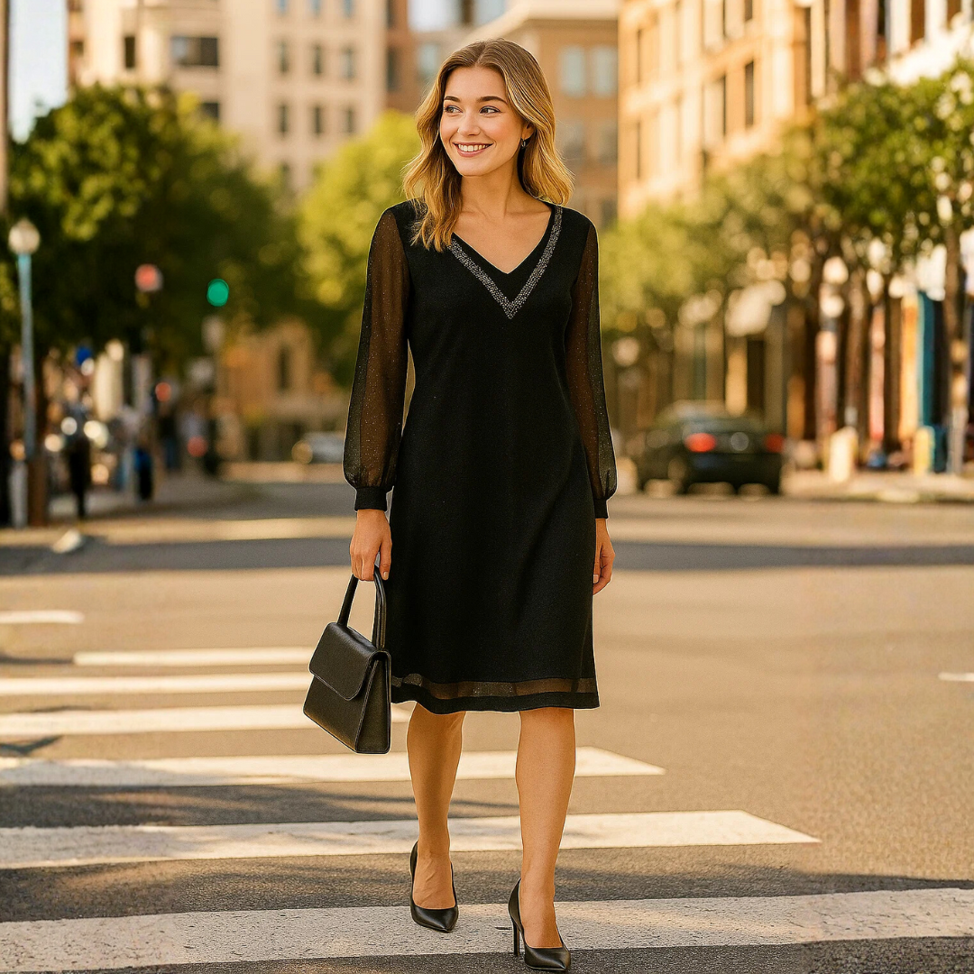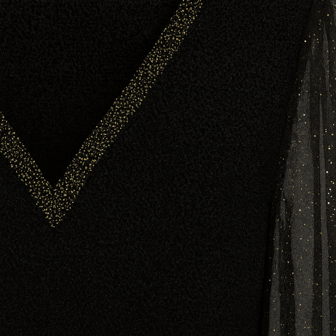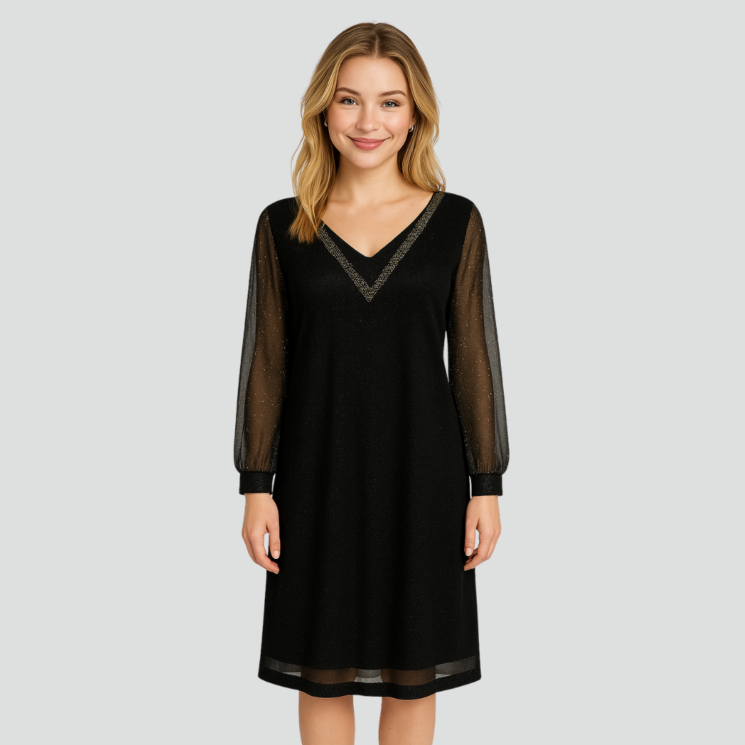 Træd ind i aftenen med raffineret lethed i Selina Mesh Kjole. Denne elegante kjole kombinerer et klassisk sort design med gennemsigtige mesh-ærmer, diskret pyntet med glitrende detaljer. Den dybe V-udskæring og det lette fald giver et sofistikeret, men ubesværet look, der smyger sig smukt om kroppen. Perfekt til særlige lejligheder, hvor du vil udstråle underspillet glamour.