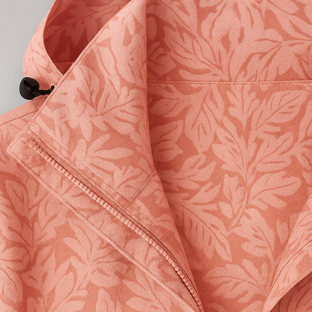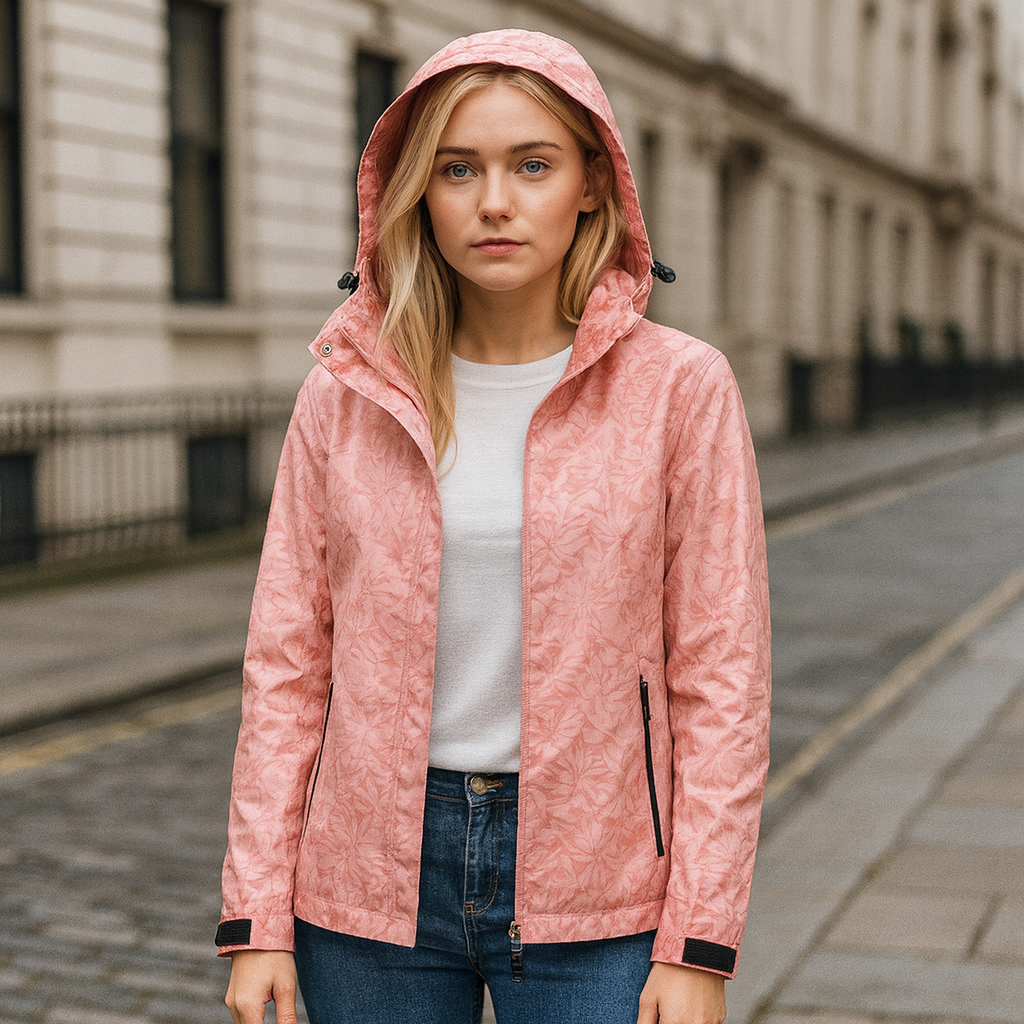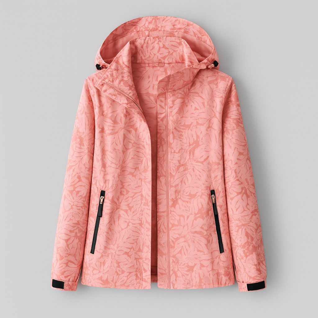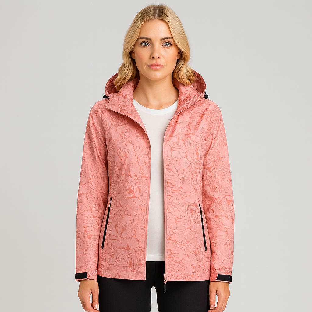 Signe Regnjakke kombinerer funktionalitet med feminin elegance. Den lette, vandafvisende overflade beskytter dig mod regn og vind, mens det diskrete bladmønster tilfører et stilfuldt twist. Jakken har justerbar hætte, lynlåslommer og en flatterende pasform, der gør den perfekt til både byliv og naturture.