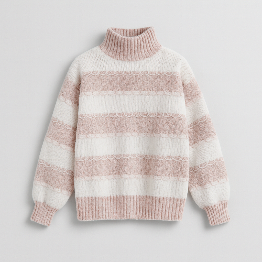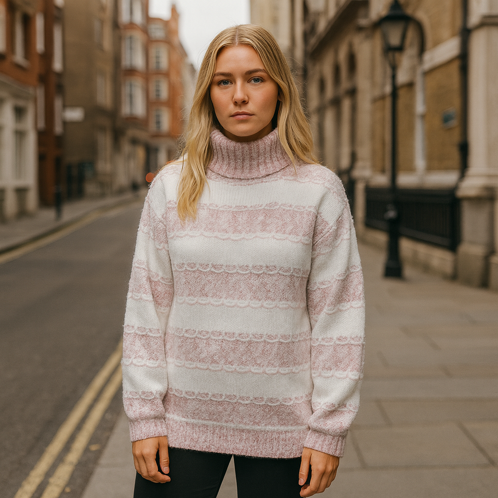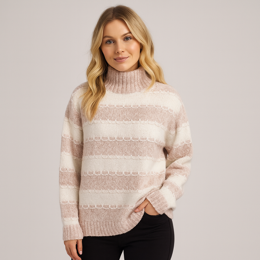 Stine Stribet Striktrøje bringer et blødt, feminint udtryk til vintergarderoben. De sarte rosa og hvide nuancer skaber et roligt, harmonisk look, mens den høje krave og afslappede pasform giver både varme og komfort. Fremstillet i en blød strikkvalitet, perfekt til kølige dage, hvor du ønsker et hyggeligt men stilfuldt outfit.